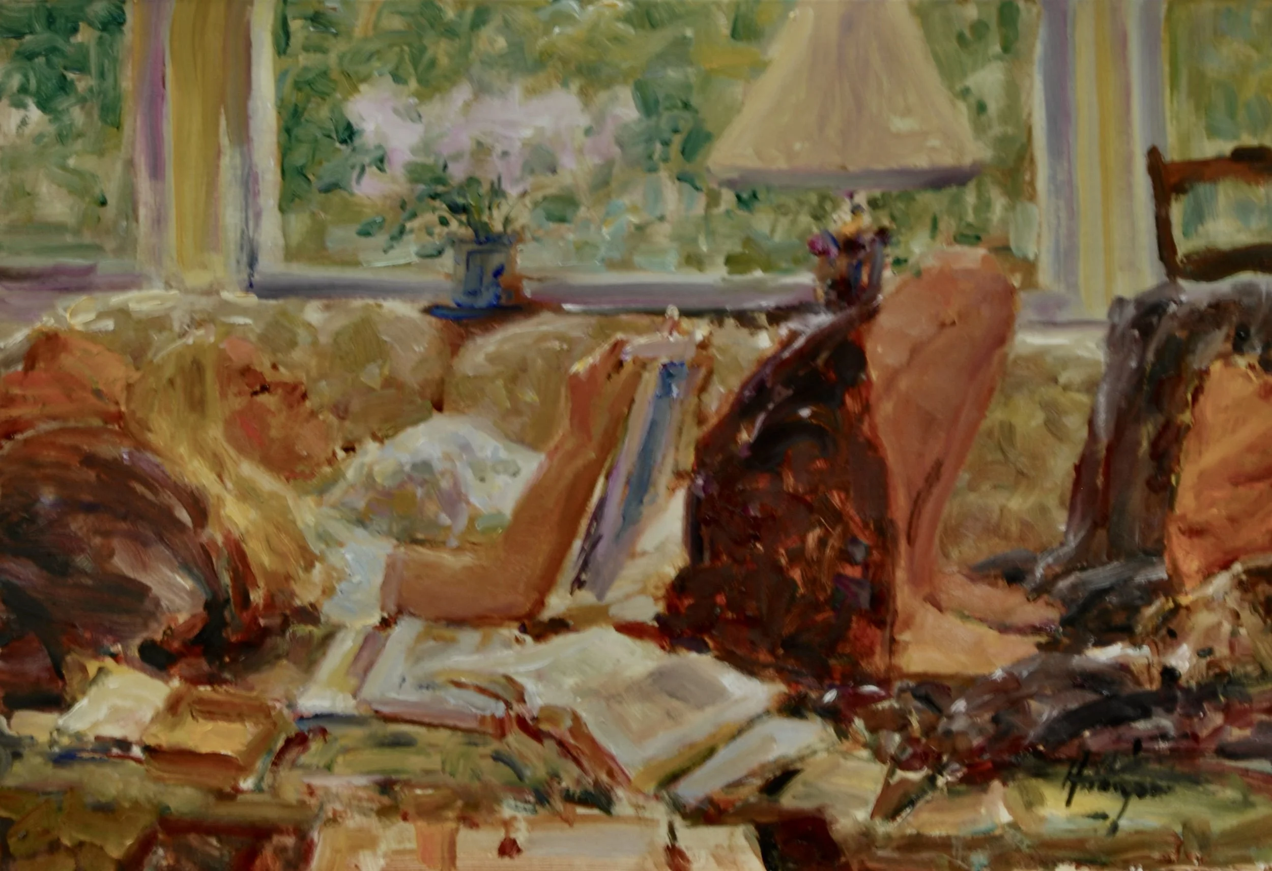 Auntie Anne had made a pumpkin pie for our visit. I hate pumpkin anything, and with a scoop of vanilla ice cream it was the worst. Why ruin good ice cream on something so terrible? Mom gave me her look and I knew if I was going to get to use my new crayons I was going to have to eat it and say it was good. Lucky for me, Dad was sitting right there next to me and when the time was right he took a fork full of pie off my plate. Why couldn't he do that when Mom made liver? We sat around the kitchen table for an hour listening to Dad talk about working in a lumber mill and spending the summers in Minnesota with his cousins. Auntie Anne had photos to show of her last trip to Minnesota. I could picture the saws and the trees my Dad sent through the big mill. I can still smell the coffee percolating on the stove in an old beat up coffee pot, as I pause from my painting. Henry wakes up from his nap and Dad’s voice fades. Those visits come to mind as Henry looks for a suitable spot in the small park below my studio window.
